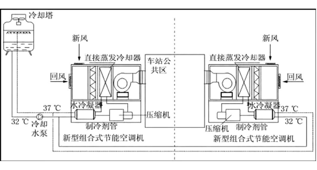 直膨式空调机组是制冷剂直接跟需要处理的空气完成热交换,中间不通过二次换热,即:制冷剂--空气。而以冷水机组和空调末端机组等组成的目前最常见的大型中央空调系统,其热交换方式就不同于直膨式空调机组,而是:制冷剂--水--空气,即制冷剂先对水吸热,生成冷冻水,冷冻水再通过管路输送到房间的风机盘管等末端机组中,通过机组内风机循环吹风,使室内空气与盘管内冷冻水热交换,生成“冷气”吹下来。